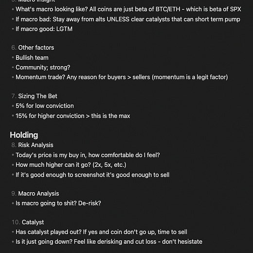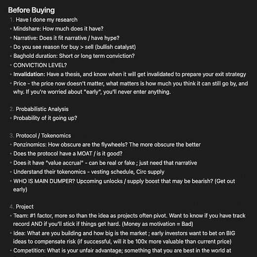 Research is extremely important in building your thesis (more on this next time). You can’t just blindly ape what your friend group tells you to - you have to know the project in order to build conviction, and conviction is what allows you to stay after shakeouts to capture the meat of the trade.